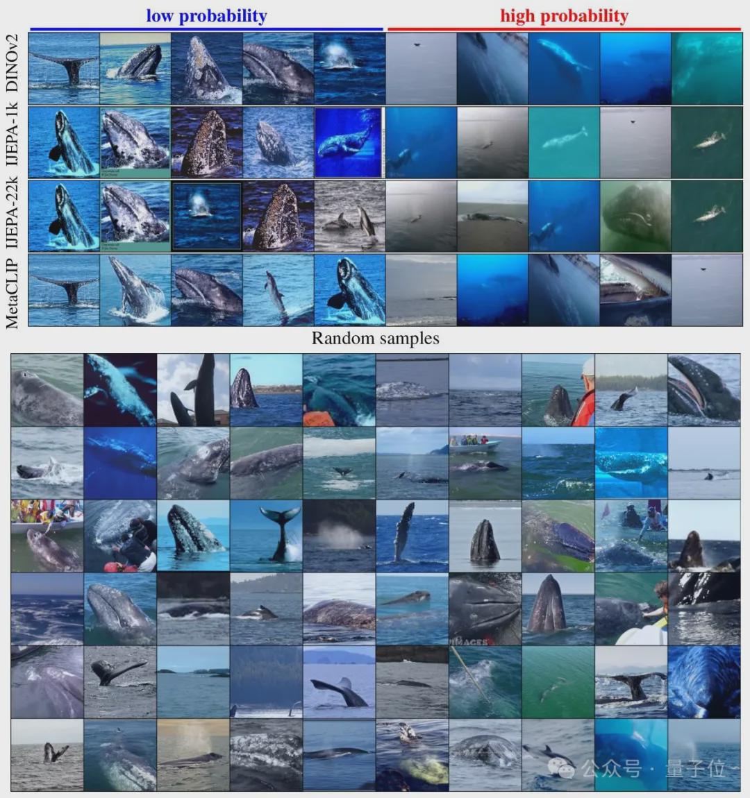在ImageNet数据集中,不同JEPAs模型对典型样本(如飞行姿态的鸟类)和罕见样本(如栖息姿态的鸟类)的JEPA-SCORE判定高度重合,证明这是JEPAs的共性能力,并不是某个模型的偶然;